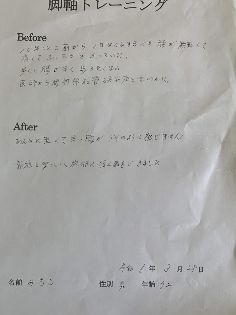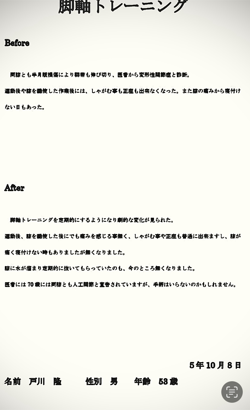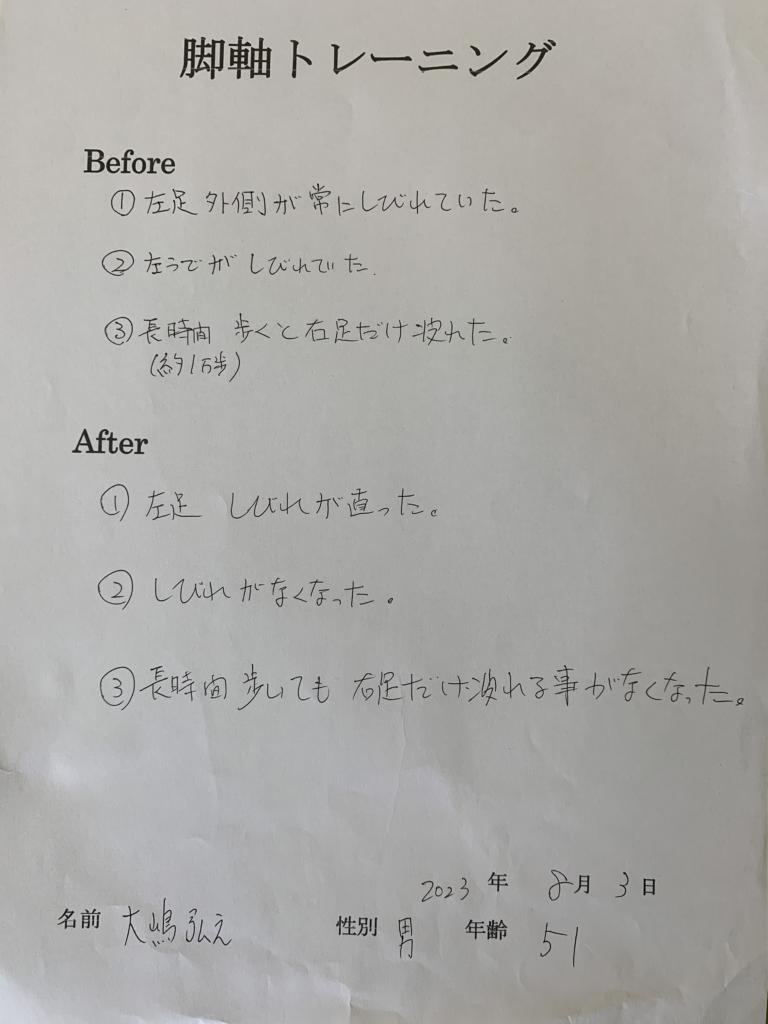 こちらのページでは当院で実際に脚軸トレーニングを受けた患者様の声を掲載しております。どうぞご覧ください。