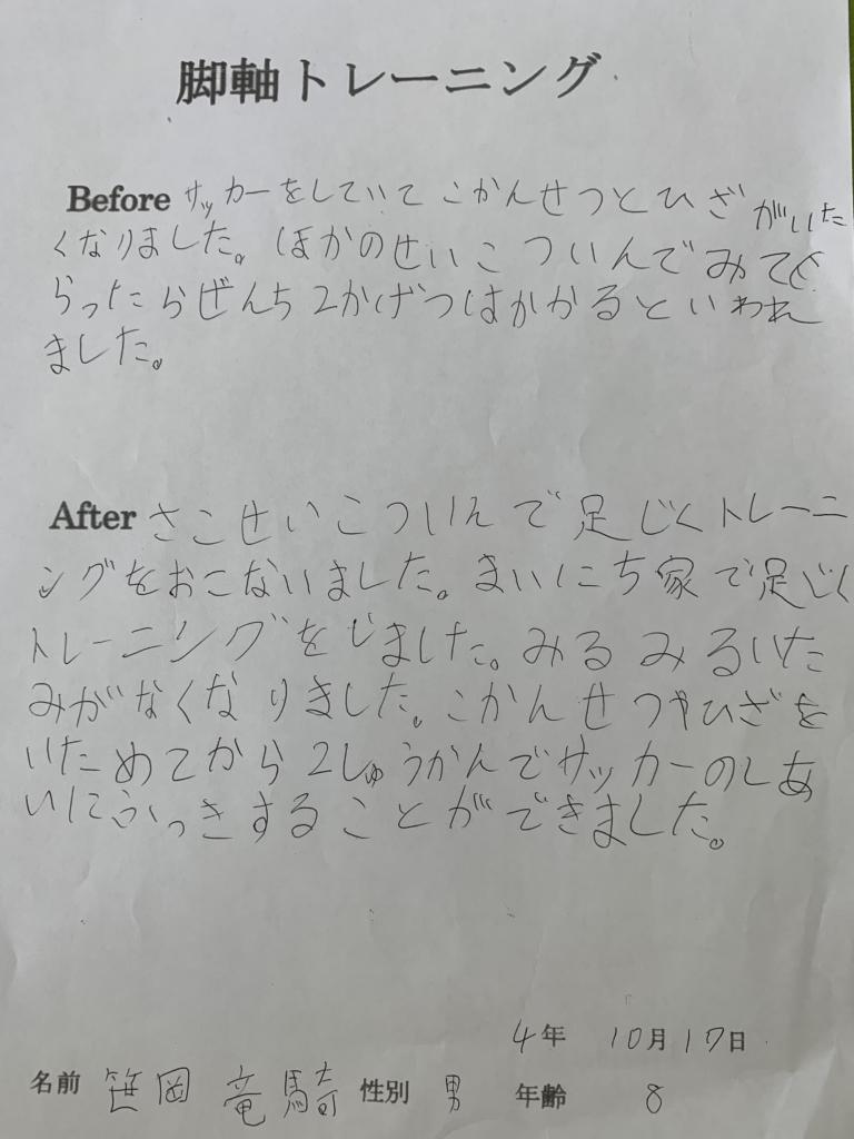 注:脚軸トレーニングを行った後、ソマレゾンを患部に貼りました。マッサージや電療は行っておりません。
